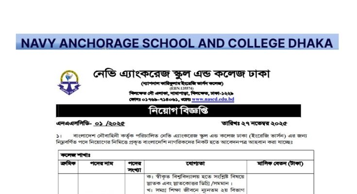 Navy Anchorage School and College Dhaka (NASCD) Job Circular 2025 has been published. The authority has published the NASCD Job Circular 2025. Navy Anchorage School and College Dhaka Teacher Job Circular 2025 is good news for job seekers. All information on the NASC Dhaka Job Circular 2025 is available below. The Navy Anchorage School and College, Dhaka, is a Government organization in Bangladesh.
