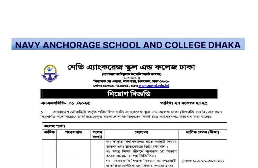 Navy Anchorage School and College Dhaka (NASCD) Job Circular 2025 has been published. The authority has published the NASCD Job Circular 2025. Navy Anchorage School and College Dhaka Teacher Job Circular 2025 is good news for job seekers. All information on the NASC Dhaka Job Circular 2025 is available below. The Navy Anchorage School and College, Dhaka, is a Government organization in Bangladesh.