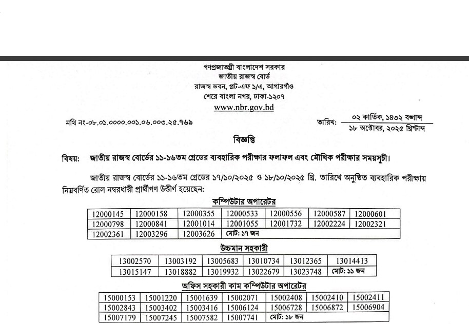 National Board of Revenue (NBR) Practical Test Result 2025: