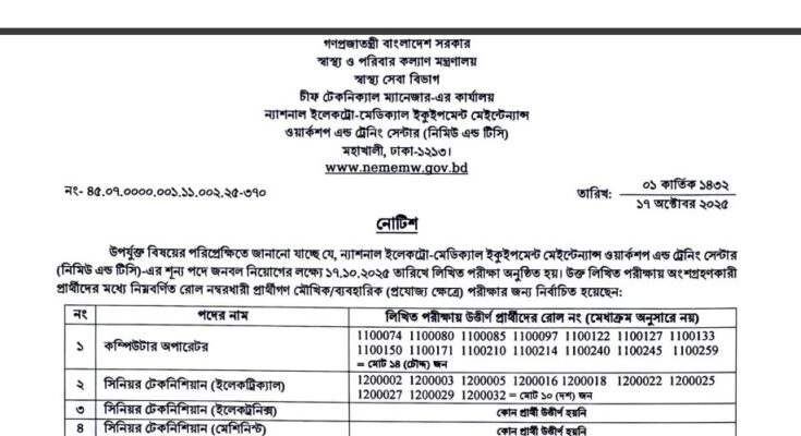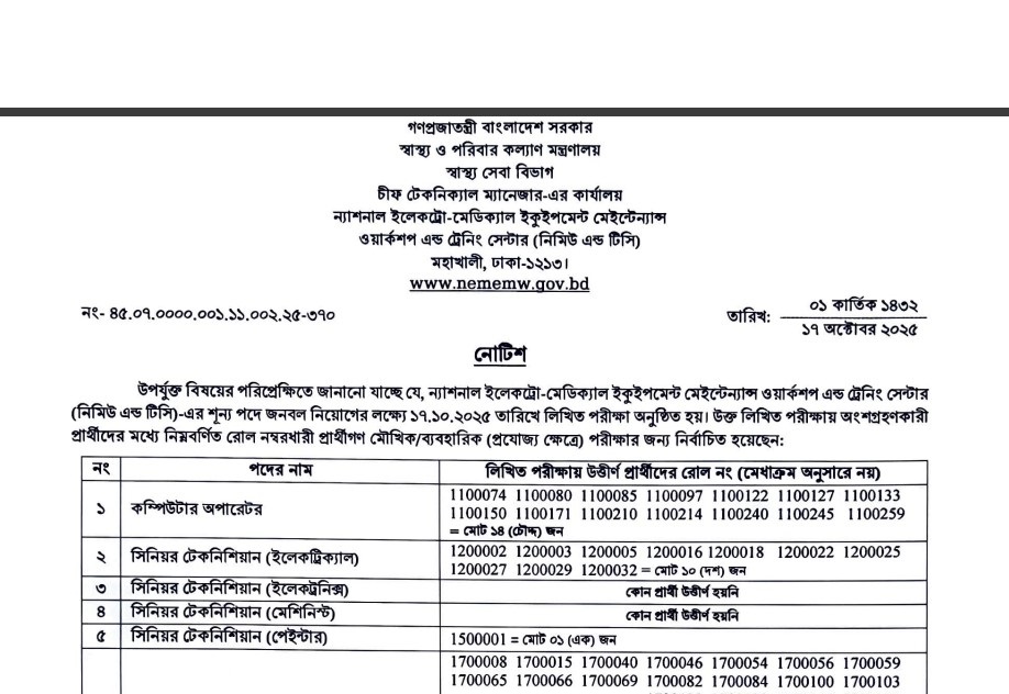 National Electro-Medical Equipment Maintenance Workshop and Training Centre (NEMEMW and TC) Job Exam Result 2025 has been published by the authority. National Electro-Medical Equipment Maintenance Workshop and Training Centre (NEMEMW and TC) Job Circular information is given below. The National Electro-Medical Equipment Maintenance Workshop and Training Centre (NEMEMW and TC) is one of the largest Government organizations in Bangladesh. The National Electro-Medical Equipment Maintenance Workshop and Training Centre (NEMEMW and TC) has published a huge job circular by the Authority. All information regarding the appointment of the National Electro-Medical Equipment Maintenance Workshop and Training Centre (NEMEMW and TC) is given on our website, jobstestbd.com. We publish all job circulars every day, Such as Government Jobs in Bangladesh, Bank Jobs in Bangladesh, Private Jobs in Bangladesh, International NGOs in Bangladesh, Private companies in Bangladesh, and Private University Jobs in Bangladesh. Bank Jobs Results, Government Jobs Results, Government University Jobs Results in Bangladesh, and all Part-time Jobs in Bangladesh and other educational support are available here on our website. We provide different types of job information, with also provide some effective information or resources and job tips which help to get a job easily. We trust that our distribution of data helps job seekers who are looking for better employment. We likewise share slanting assets for learners who are expanding their insight. Our prime target turns into a trustworthy occupation round site in Bangladesh by distributing a genuine update that enables opportunities for individuals. All the jobs on this website are not only for unemployed people but also for employed people. All types of suggestions and question solutions for the different competitive exams are available here. We provide all types of educational support on our website, jobstestbd.com. So every day, you visit our website for all kinds of educational support. Please like our Facebook page, jobstestbd.com.