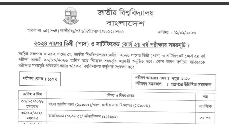 NU Degree 2nd Year Exam Routine 2026 has been published. National University Degree 2nd Year Exam Routine 2026 has been published by the Authority. National University (NU) Degree 2nd Year Routine 2026 is important news for NU students in Bangladesh. All information on the Degree Second Year Exam Routine 2026 is available below. The National University (NU) is a Government Organization in Bangladesh.