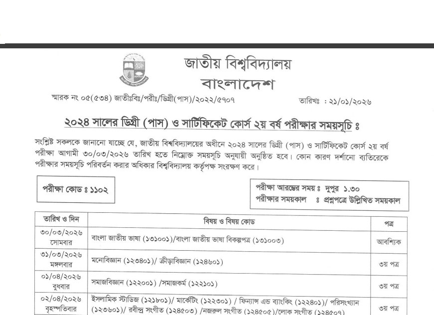 National University Degree 2nd Year Exam Routine 2026: