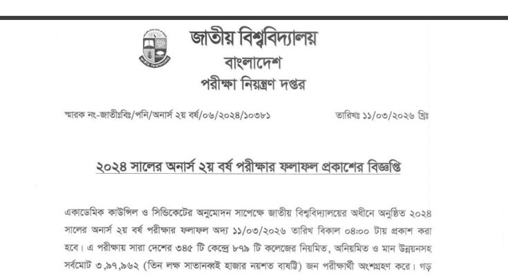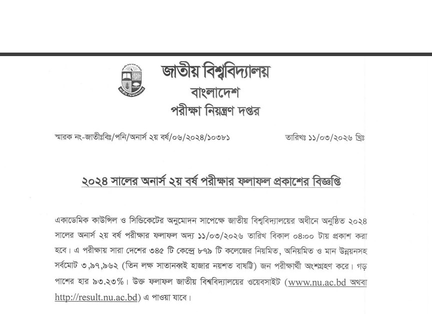 National University Honours 2nd Year Exam Result 2026: