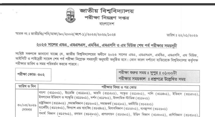 NU Masters Final Year Exam Routine 2026 has been published. National University Master’s Final Year Exam Routine 2026 has been published by the Authority. National University (NU) Master’s Final Year Routine 2026 is important news for NU students in Bangladesh. All information on the Master’s Final Year Exam Routine 2026 is available below. The National University (NU) is a Government Organization in Bangladesh.