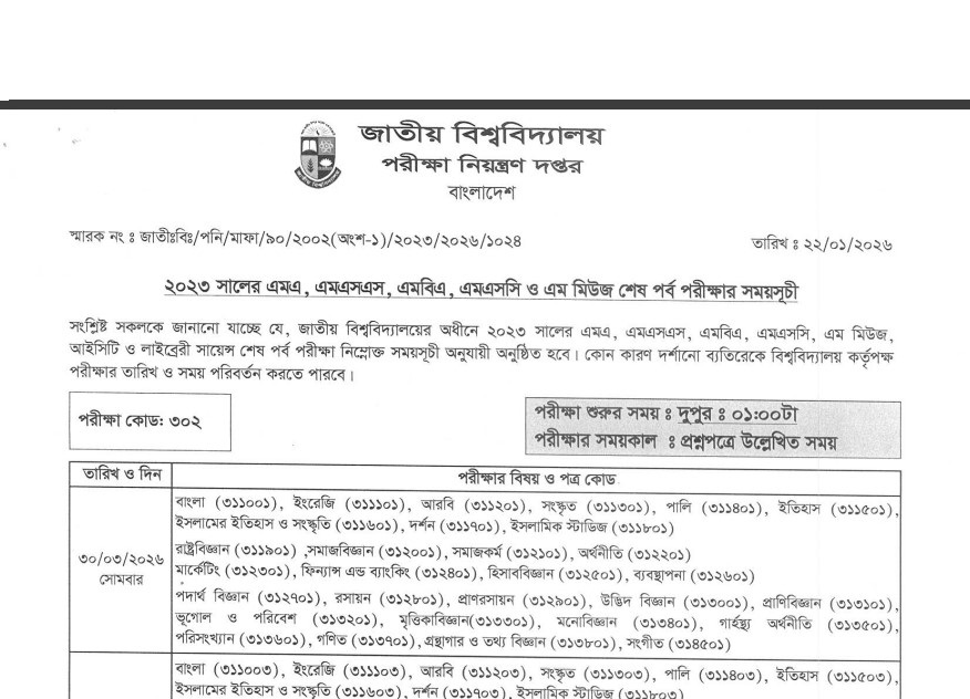 NU Masters Final Year Exam Routine 2026 has been published. National University Master’s Final Year Exam Routine 2026 has been published by the Authority. National University (NU) Master’s Final Year Routine 2026 is important news for NU students in Bangladesh. All information on the Master’s Final Year Exam Routine 2026 is available below. The National University (NU) is a Government Organization in Bangladesh.