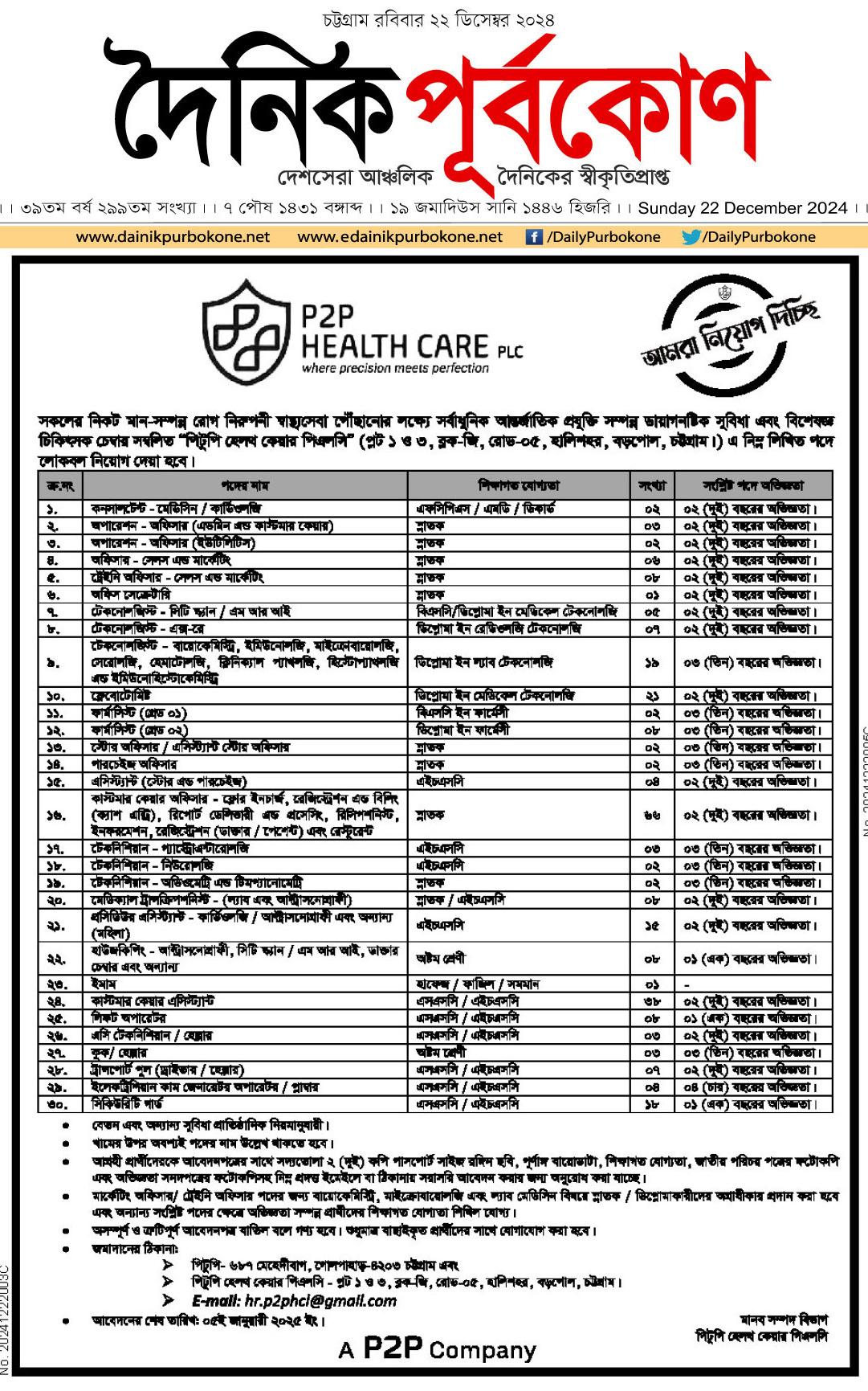 The authority has published the P2P Health Care Chittagong Job Circular 2024. P2P Health Care PLC Job Circular All information is given above. P2P Health Care PLC is one of the largest Private organizations in Bangladesh. The P2P Health Care PLC has published a huge job circular by the Authority. All information regarding the job appointment at the P2P Health Care PLC is given on our website jobstestbd.com. We Publish all job circulars daily, Such as Government Jobs in Bangladesh, Bank Jobs in Bangladesh, Private Jobs in Bangladesh, International NGOs in Bangladesh, Private companies in Bangladesh, and Private University Jobs in Bangladesh. Bank Jobs Results, Government Jobs Results, Government University Jobs Results in Bangladesh, and all Part-time Jobs in Bangladesh and other educational support are available here on our website. We provide different types of job information, with also some effective information or resources and job tips that help people get a job easily. Jobstestbd.com trusts that our distributing data helps activity searchers who are looking for superior employment. We likewise share slanting assets for learners who are expanding their insight. Our principle target turns into a trusty occupations round site in Bangladesh by distributing a genuine refresh that enables joblessness to individuals. All the jobs on this website are not only for unemployed people but also for employed people. Suggestions and question solutions for the different competitive exams are available here. We provide all types of educational support on our website jobstestbd.com. So every day tune in with our website for educational support. Please like our Facebook page jobstestbd.com.