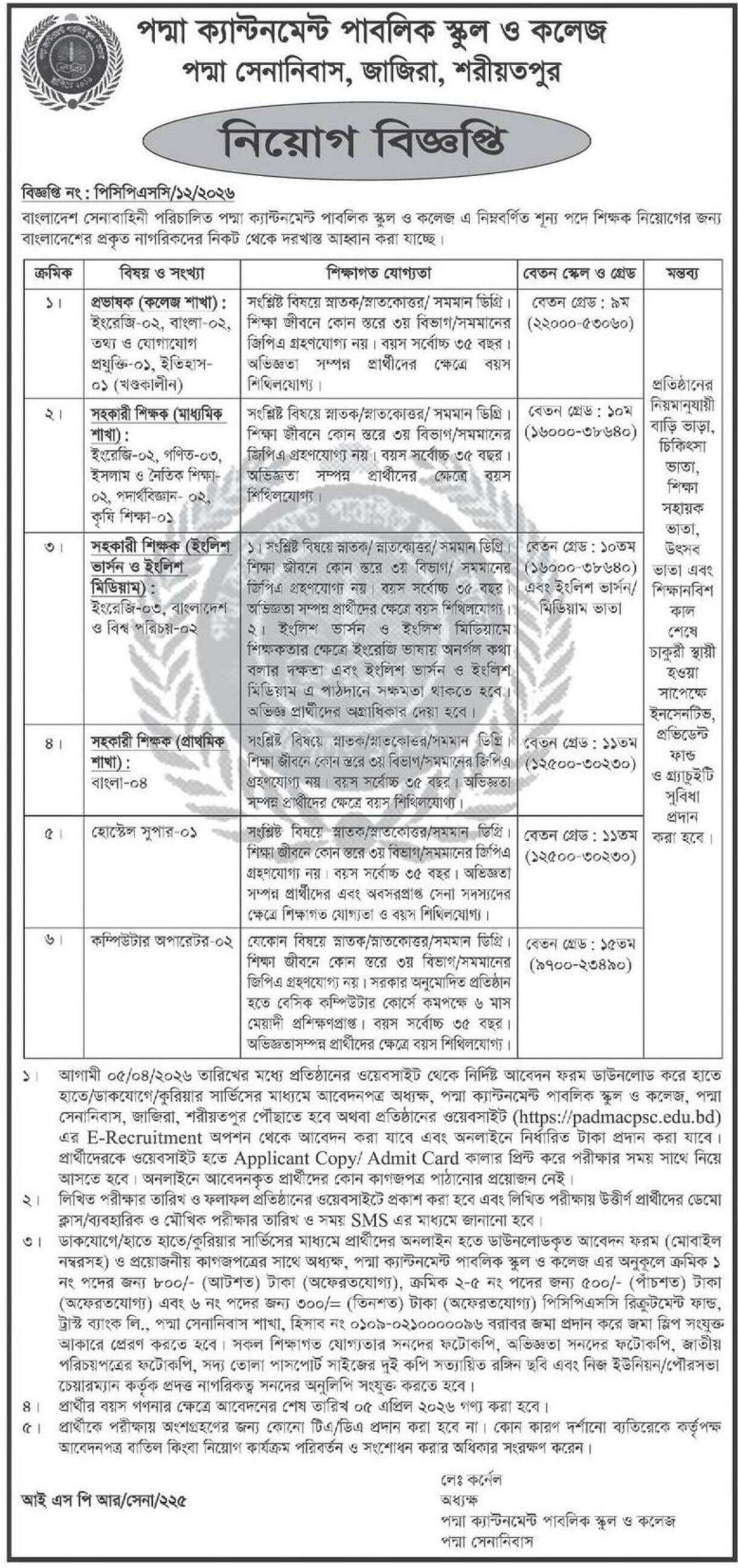 See/download Padma Cantonment Public School and College Job Circular 2026, Job Apply Instructions, Job Application Form, Application Fee, Payment Process, Salary, Age, and Other Information in the image below: