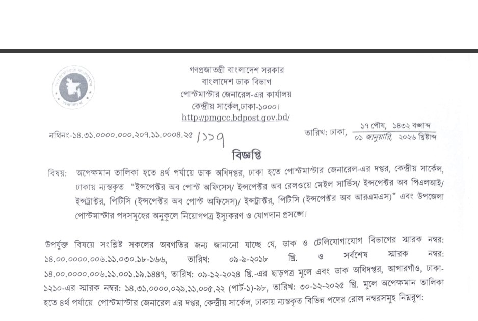 The authority has published the Office of the Postmaster General Central Circle Job Exam Result 2026. Office of the Postmaster General Central Circle (PMGCC) Job Circular information is given above. The Office of the Postmaster General Central Circle (PMGCC) is one of the largest Government organizations in Bangladesh. The Office of the Postmaster General Central Circle (PMGCC) Job Circular is given on our website, jobstestbd.com. We publish all job circulars daily, Such as Government Jobs in Bangladesh, Bank Jobs in Bangladesh, Private Jobs in Bangladesh, International NGOs in Bangladesh, Private Companies in Bangladesh, and Private University Jobs in Bangladesh. Bank Jobs Results, Government Jobs Results, Government University Jobs Results in Bangladesh, and all Part-time Jobs in Bangladesh and other educational support are available here on our website. We provide different types of job information, and also provide some effective information or resources and job tips that help to get a job easily. We trust that our distribution of data helps the activity searchers who are finding superior employment. We likewise share slanting assets for learners who are expanding their insight. Our prime target turns into a trustworthy occupations round site in Bangladesh by distributing a genuine update that enables individuals to individuals. All the jobs on this website are not only for unemployed people but also for employed people. Suggestions and question solutions for the different competitive exams are available here. We provide all types of educational support on our website, jobstestbd.com. So every day, tune in to our website for all kinds of educational support. Please like our Facebook page, jobstestbd.com.