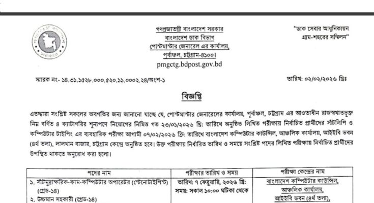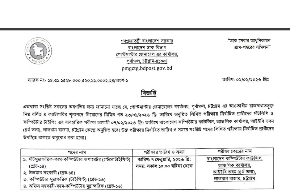 PMGEC Practical Test Date 2026 has been published. The authority has published the Postmaster General’s Office Eastern Circle (PMGEC) Practical Test Date 2026. Post Office Chittagong Practical Test Date 2026 is good news for job seekers in Bangladesh. All information on the Postmaster General Chattogram Practical Test Date 2026 is available below. Post Office Chattogram Practical Test Date 2026 essential news will be available in our post. The Office of the Postmaster-General, Eastern Circle, Chattogram, is a Government Organization in Bangladesh.