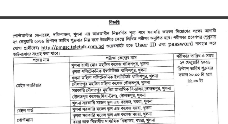 PMGSC Exam Date and Admit Download 2026 have been published. Office of the Postmaster General Southern Circle (PMGSC) Exam Date and Admit Download 2026 have been published by the authority. Office of the Postmaster-General Khulna Circle Exam Date and Admit Download 2026 is good news for job seekers in Bangladesh. All information on the Post Office Khulna Circle Exam Date and Admit Download 2026 is available below. The Office of the Postmaster-General Southern Circle (PMGSC) is a Government Organization in Bangladesh.
