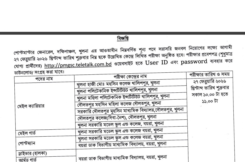 PMGSC Exam Date and Admit Download 2026 have been published. Office of the Postmaster General Southern Circle (PMGSC) Exam Date and Admit Download 2026 have been published by the authority. Office of the Postmaster-General Khulna Circle Exam Date and Admit Download 2026 is good news for job seekers in Bangladesh. All information on the Post Office Khulna Circle Exam Date and Admit Download 2026 is available below. The Office of the Postmaster-General Southern Circle (PMGSC) is a Government Organization in Bangladesh.