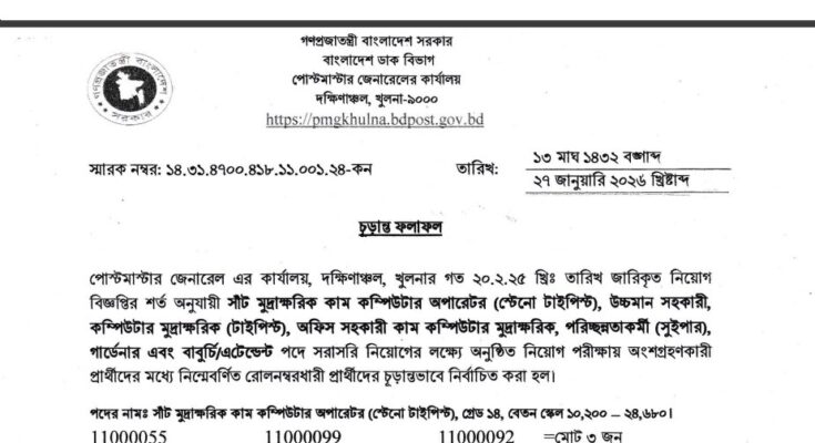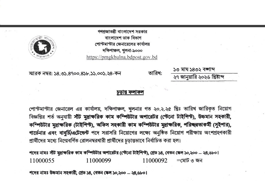 PMGSC Exam Result 2026 has been published. Office of the Postmaster General Southern Circle (PMGSC) Exam Result 2026 has been published by the authority. Office of the Postmaster-General Khulna Circle Exam Result 2026 is good news for job seekers in Bangladesh. All information on the Post Office Khulna Circle Exam Result 2026 is available below. The Office of the Postmaster-General Southern Circle (PMGSC) is a Government Organization in Bangladesh.