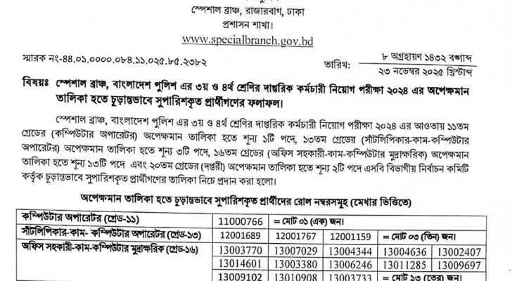Police Special Branch Panel Result 2025 has been published. The authority has published the SB Dhaka Doftry Panel Result 2025. Bangladesh Police Special Branch Panel Result 2025 is good news for job seekers. All information on the Police Special Branch Panel Result 2025 is available below. Bangladesh Police Special Branch is a Government organization in Bangladesh.
