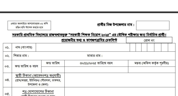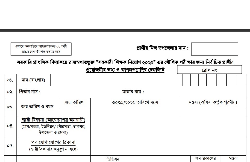 মৌখিক পরীক্ষার জন্য নির্বাচিত প্রার্থীগণকে অনলাইনে আবেদনের আপলোডকৃত ছবি, আবেদনের কপি, সংশ্লিষ্ট ইউনিয়ন পরিষদের চেয়ারম্যান/পৌরসভার মেয়র/সিটি কর্পোরেশনের কাউন্সিলর কর্তৃক প্রদত্ত নাগরিকত্ব সনদ; জাতীয় পরিচয়পত্র; লিখিত পরীক্ষার প্রবেশপত্র; মুক্তিযোদ্ধা, শহীদ মুক্তিযোদ্ধা ও বীরাঙ্গনার সন্তানদের কোটায় আবেদনকারী প্রার্থীর ক্ষেত্রে সরকারের সর্বশেষ সিদ্ধান্ত অনুসারে মুক্তিযুদ্ধ বিষয়ক মন্ত্রণালয় কর্তৃক প্রদত্ত মুক্তিযোদ্ধার গেজেট ও মুক্তিযোদ্ধার সাথে সম্পর্ক সনদের সত্যায়িত কপি; শারীরিক প্রতিবন্ধী (সুবর্ণ নাগরিক কার্ডধারী) ও তৃতীয় লিঙ্গের প্রার্থীর ক্ষেত্রে সমাজসেবা অধিদপ্তর কর্তৃক প্রদত্ত সনদ; ক্ষুদ্র নৃ-গোষ্ঠীর প্রার্থীদের ক্ষেত্রে সংশ্লিষ্ট উপজেলা নির্বাহী কর্মকর্তা এবং সিটি কর্পোরেশন এলাকা হলে জেলা প্রশাসক কর্তৃক প্রদত্ত ক্ষুদ্র নৃ-গোষ্ঠী পরিচিতি বিষয়ক সনদ; এবং শিক্ষাগত যোগ্যতার সনদসহ অন্যান্য প্রয়োজনীয় কাগজপত্র ন্যূনতম ৯ম গ্রেডের গেজেটেড কর্মকর্তা কর্তৃক সত্যায়িত করে ২৭ জানুয়ারি ২০২৬ তারিখের মধ্যে স্ব স্ব জেলা প্রাথমিক শিক্ষা অফিসে আবশ্যিকভাবে জমা দিয়ে প্রাপ্তি স্বীকারপত্র সংগ্রহ করতে হবে। জেলা প্রাথমিক শিক্ষা অফিসে সকল, সনদ ও প্রয়োজনীয় কাগজপত্রের ফটোকপি (সত্যায়িত) জমা প্রদানের সময় উক্ত কাগজপত্রের মূলকপি জেলা প্রাথমিক শিক্ষা অফিসারকে প্রদর্শন করতে হবে। মৌখিক পরীক্ষার সময় উপরে বর্ণিত সকল সনদ, প্রাপ্তি স্বীকারপত্র ও অন্যান্য কাগজপত্রের মূল কপি প্রার্থীকে সঙ্গে আনতে হবে। মৌখিক পরীক্ষার তারিখ ও সময় সংশ্লিষ্ট জেলা প্রাথমিক শিক্ষা অফিসের ওয়েবসাইটে ও নোটিশ বোর্ডে প্রকাশ করা হবে।