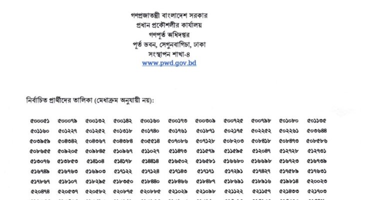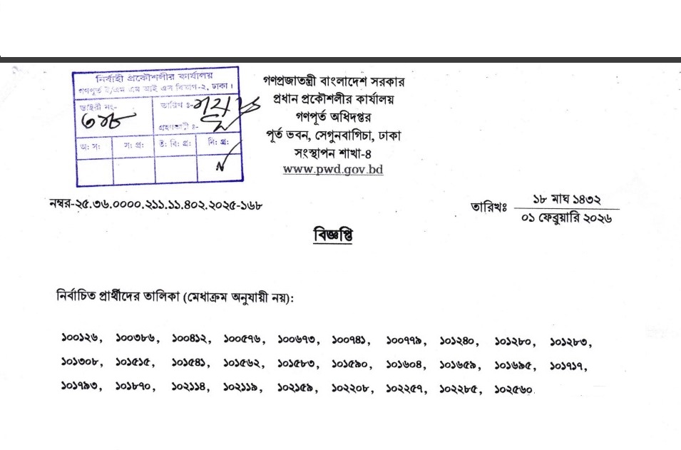 Public Works Department (PWD) Final Viva Result 2026 has been published. The authority has published the Public Works Department Final Result 2026. PWD Office Sohayok Final Result 2026 is good news for job seekers. All information on the PWD Work Assistant Final Result 2026 is available below. The Public Works Department (PWD) is a Government Organization in Bangladesh.