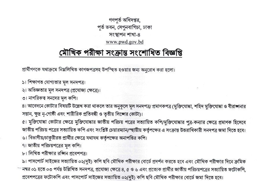 Public Works Department (PWD) Viva Date 2026 has been published. The authority has published the Public Works Department Viva Date 2026. The PWD Office Assistant Cum Computer Typist Viva Date 2026 is good news for job seekers. All information on the PWD Office Sohayok Viva Date 2026 is available below. The Public Works Department (PWD) is a Government Organization in Bangladesh.