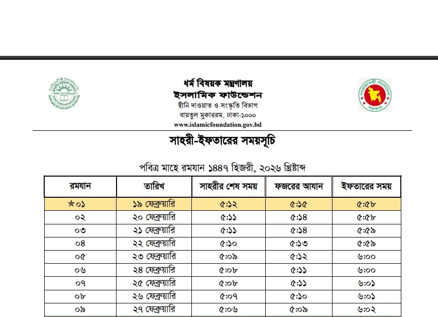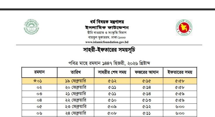 The authority has published the Ramadan Sehri and Iftar Time 2026. Sehri and Iftar Time 2026 is good news for Muslims in Bangladesh. All information related to the Bangladesh Ramadan Sehri and Iftar Time 2026 is available below. The Islamic Foundation is a government organization in Bangladesh. The final declaration of the Islamic Foundation Sehri and Iftar Time for 2026 was released on 20th January 2026. Ramadan will start on19th February 2026 and will probably end on 20th March 2026.