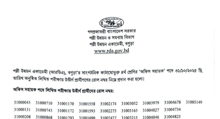 RDA Bogura Exam Result 2025 has been published. Rural Development Academy (RDA) Exam Result 2025 has been published by the authority. Rural Development Academy Bogura Exam Result 2025 is good news for job seekers in Bangladesh. All information on the RDA Office Sohayok Exam Result 2025 is available below. Rural Development Academy (RDA), Bogura, is a Government Organization in Bangladesh.