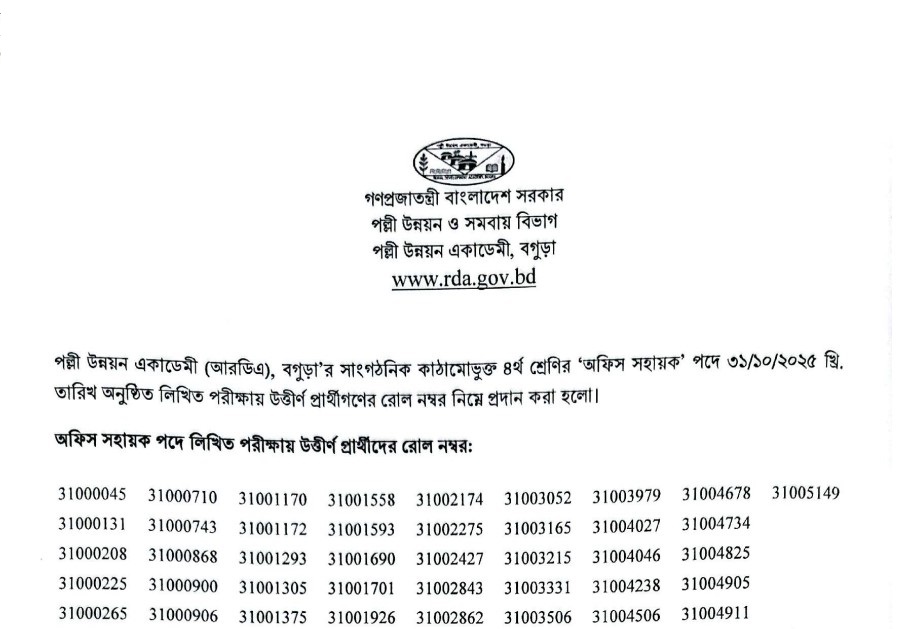 RDA Bogura Exam Result 2025 has been published. Rural Development Academy (RDA) Exam Result 2025 has been published by the authority. Rural Development Academy Bogura Exam Result 2025 is good news for job seekers in Bangladesh. All information on the RDA Office Sohayok Exam Result 2025 is available below. Rural Development Academy (RDA), Bogura, is a Government Organization in Bangladesh.