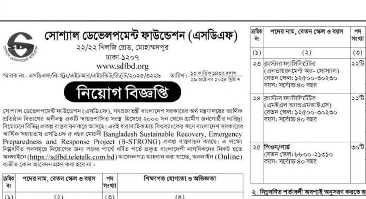Social Development Foundation (SDF) Job Circular 2025 has been published. The authority has published the SDF Job Circular 2025. Social Development Foundation Job Circular 2025 is good news for job seekers. All information on the SDF Cluster Coordinator Job Circular 2025 is available below. Social Development Foundation (SDF) is a Government organization in Bangladesh.