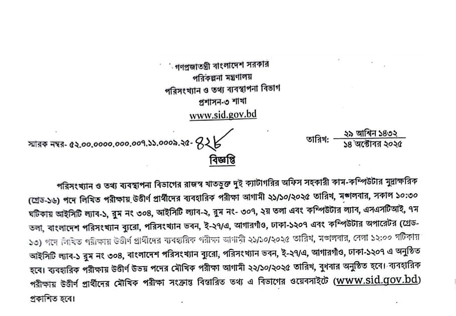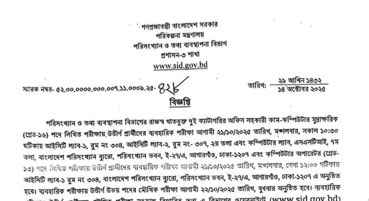 Statistics and Informatics Division (SID) Viva and Practical Test Date 2025 has been published. The authority has published the SID Viva and Practical Test Date 2025. The Statistics and Informatics Division Viva and Practical Test Date 2025 is good news for students. All information on the SID Office Assistant Cum Computer Typist Practical Test Date 2025 is available below. The Statistics and Informatics Division (SID) is a government organization in Bangladesh.