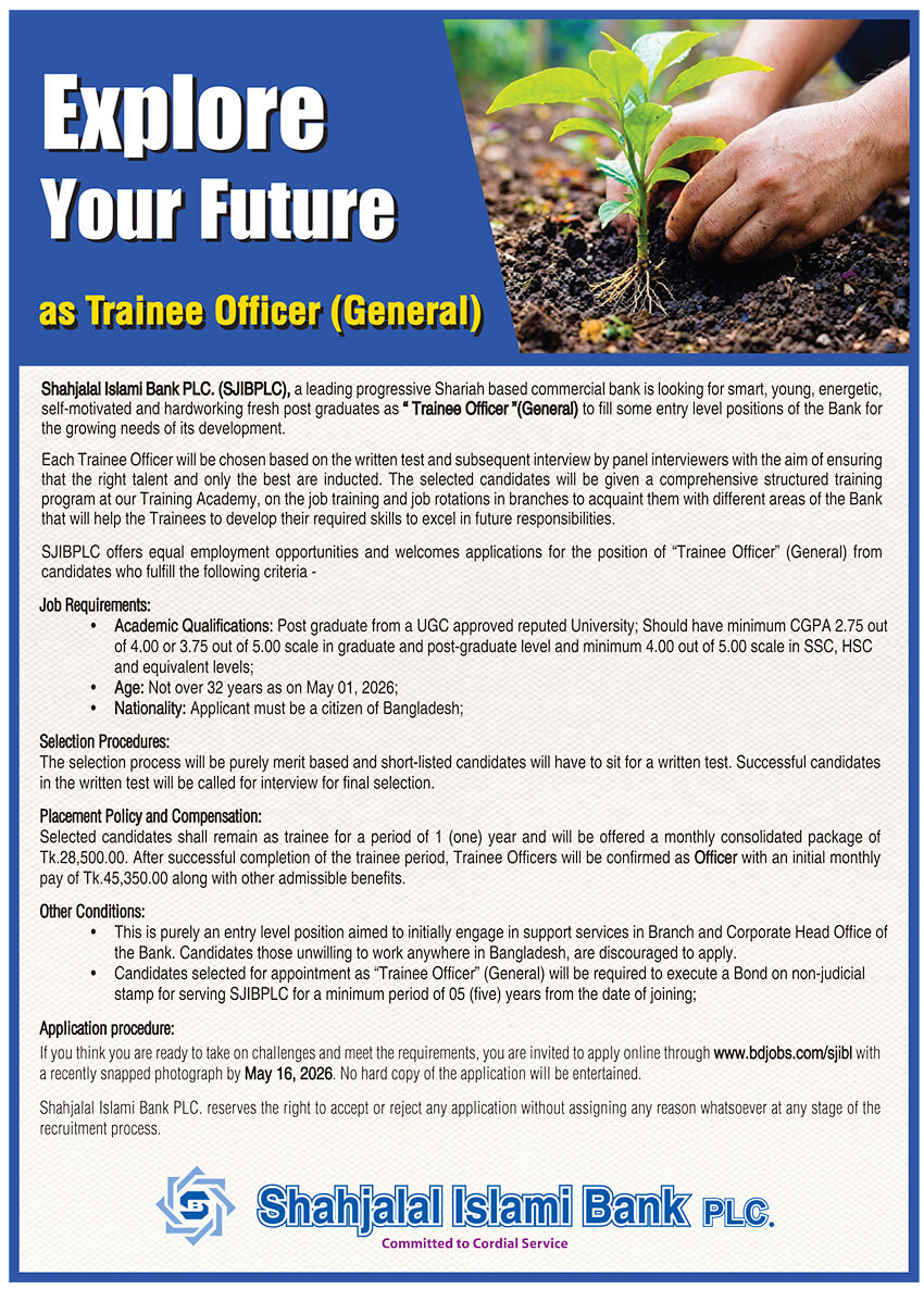 Shahjalal Islami Bank PLC Trainee Officer Job Circular 2026 has been published. The authority has published the SJIBPLC Job Circular 2026. Shahjalal Islami Bank TO Job Circular 2026 is hopeful news for job seekers in Bangladesh. All information on the Shahjalal Islami Bank PLC Trainee Officer (General) Job Circular 2026 is available below. Shahjalal Islami Bank PLC is a private bank in Bangladesh.