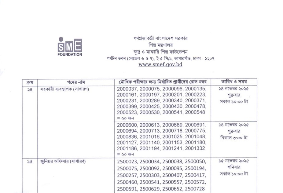 The authority has published the SME Foundation (SMEF) Exam Result 2025. Small and Medium Enterprise Foundation (SMEF) Exam Date and Admit Download information is given above. Small and Medium Enterprise Foundation (SMEF) is one of the largest Government organizations in Bangladesh. Small and Medium Enterprise Foundation (SMEF) has published a huge job circular by the Authority. All information regarding the appointment of the Small and Medium Enterprise Foundation (SMEF) is given on our website, jobstestbd.com. We publish all job circulars every day, Such as Government Jobs in Bangladesh, Bank Jobs in Bangladesh, Private Jobs in Bangladesh, International NGO in Bangladesh, Private companies in Bangladesh, and Private University Jobs in Bangladesh. Bank Jobs Results, Government Jobs Results, Government University Jobs results in Bangladesh, and all Part-time Jobs in Bangladesh, and other educational support are available here on our website. We provide different types of job information, with also provide some effective information or resources and job tips which help to get a job easily. We trust that our distribution data helps job seekers who are looking a superior employment. We likewise share slanting assets for learners who are expanding their insight. Our prime target turns into a trusty occupations round site in Bangladesh by distributing a genuine update that enables the jobless individuals to. All the jobs on this website are not only for unemployed people but also for employed people. All types of suggestions, question solutions for the different competitive exams are available here. We provide all types of educational support on our website, jobstestbd.com. So every day, tune in to our website for all kinds of educational support. Please like our Facebook page, jobstestbd.com.