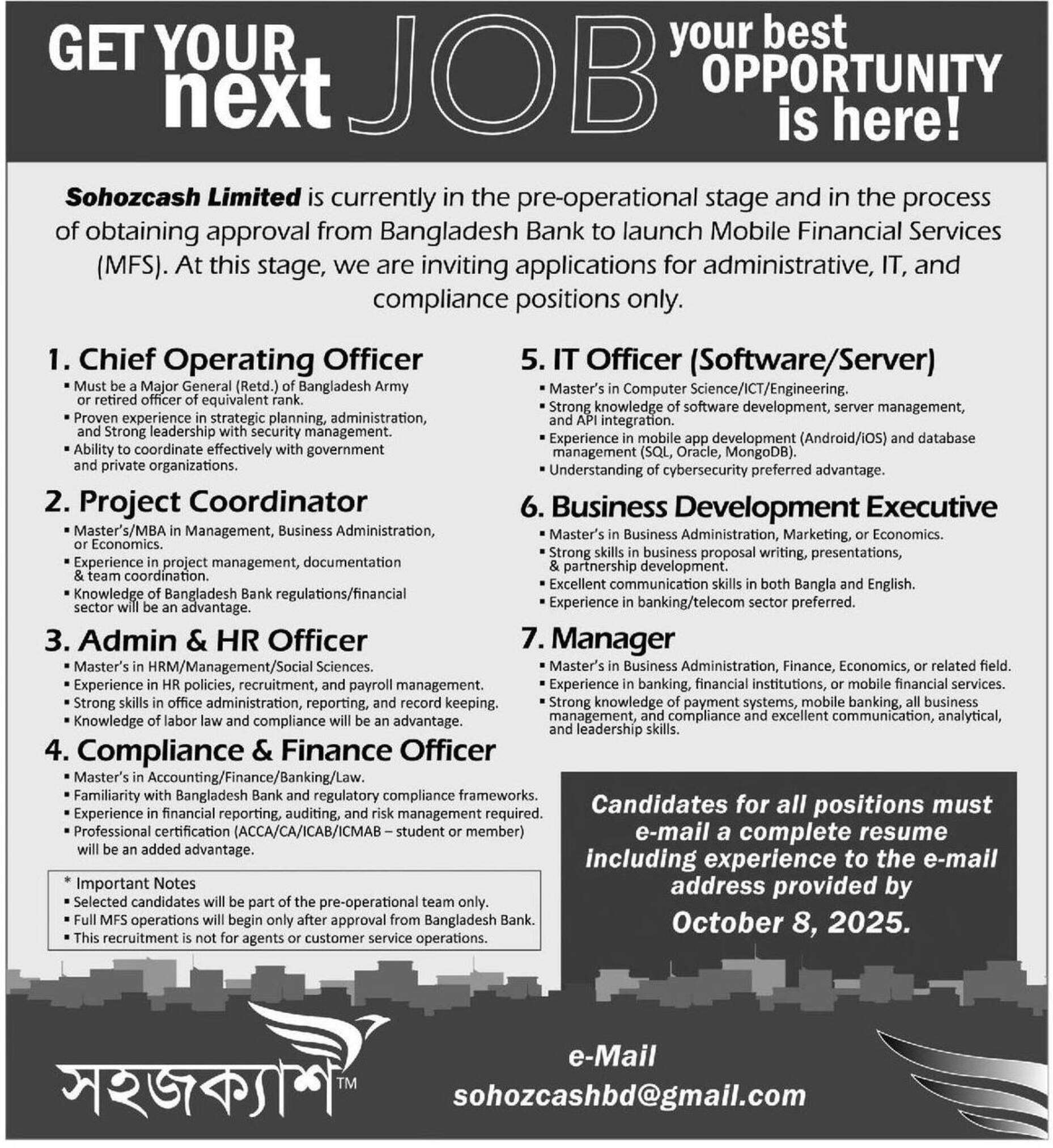 See/download Sohozcash Limited Mobile Financial Services Job Circular 2025, Job Application Form, Job Apply Instructions, Application Fee, Payment Process, Salary, Age, and Other Information from the image below: