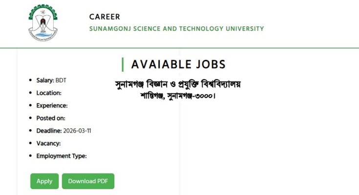 Sunamganj Science and Technology University (SSTU) Job Circular 2026 has been published. The authority has published the SSTU Job Circular 2026. SSTU Teacher Job Circular 2026 is good news for job seekers. All information on the Sunamganj Science and Technology University Job Circular 2026 is available below. The Sunamganj Science and Technology University (SSTU) is a government organization in Bangladesh.