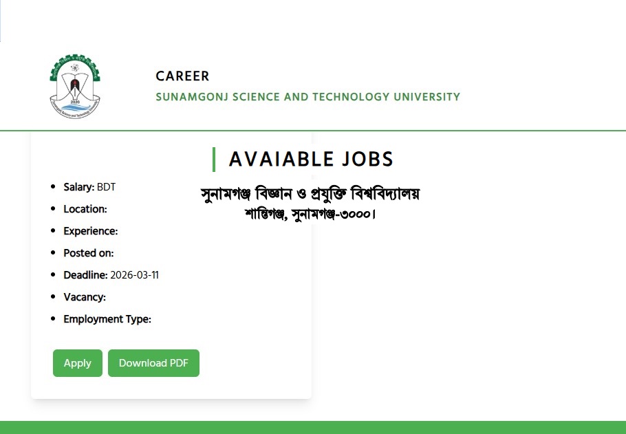 The authority has published the SSTU Job Circular 2026. Sunamganj Science and Technology University (SSTU) Job Circular information is given above. The Sunamganj Science and Technology University is one of the largest Government organizations in Bangladesh. The Sunamganj Science and Technology University (SSTU) Job Circular is available on our website, jobstestbd.com. We publish all job circulars daily, Such as Government Jobs in Bangladesh, Bank Jobs in Bangladesh, Private Jobs in Bangladesh, International NGOs in Bangladesh, Private companies in Bangladesh, and Private University Jobs in Bangladesh. Bank Jobs Results, Government Jobs Results, Government University Jobs Results in Bangladesh, and all Part-time Jobs in Bangladesh and other educational support are available here on our website. We provide different types of job information, as well as some effective information, resources, and job tips that help you get a job easily. We trust that our data distribution helps job seekers seek better employment. We likewise share slanting assets for learners who are expanding their insight. Our main target is to provide trustworthy employment opportunities around the site in Bangladesh by distributing a genuine update that creates opportunities for individuals. All the jobs on this website are not only for unemployed people but also for employed people. Suggestions and question solutions for the different competitive exams are available here. We provide all types of educational support on our website, jobstestbd.com. So every day, visit our website for all kinds of educational support. Please like our Facebook page, jobstestbd.com.