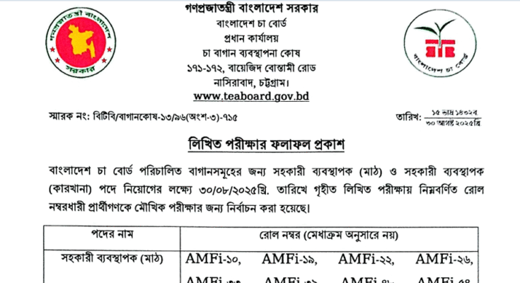 Bangladesh Tea Board Job Exam Result 2025 has been published. The authority has published the Tea Board Exam Result 2025. The Tea Board Assistant Manager Exam Result 2025 is good news for job seekers. All the Bangladesh Tea Board Written Exam Result 2025 information is available below. Bangladesh Tea Board is a Government organization in Bangladesh.