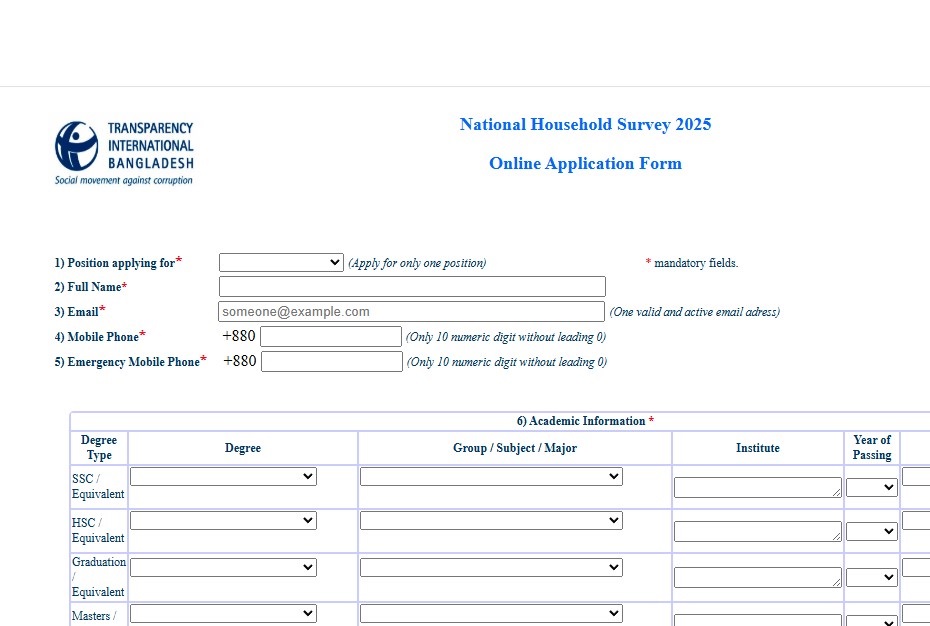 See/download Transparency International Bangladesh Job Circular 2025, Job Application Form, Job Apply Instructions, Educational Qualification, Salary, Application Fee, Age, and Other Information from the images below: