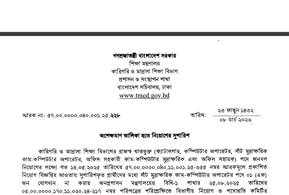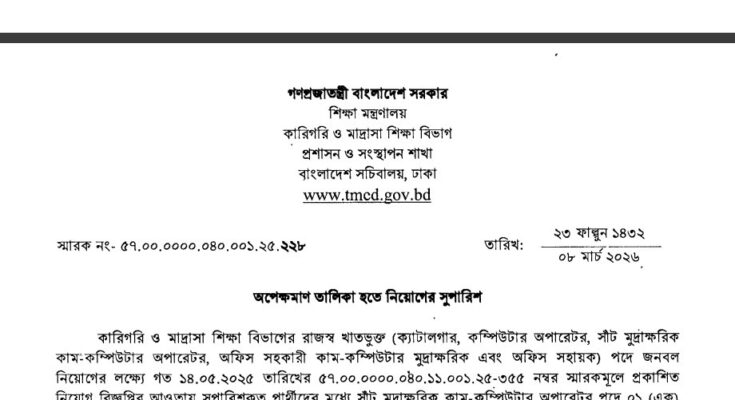 The Technical and Madrasah Education Division (TMED) Job Panel Result 2026 has been published. The Technical and Madrasah Education Division Job Panel Result 2026 has been published by the authority. The TMED Job Panel List 2026 is good news for job seekers in Bangladesh. All information on the Technical and Madrasah Education Division Job Panel Result 2026 is available below. The Technical and Madrasah Education Division (TMED) is a Government Organization in Bangladesh.
