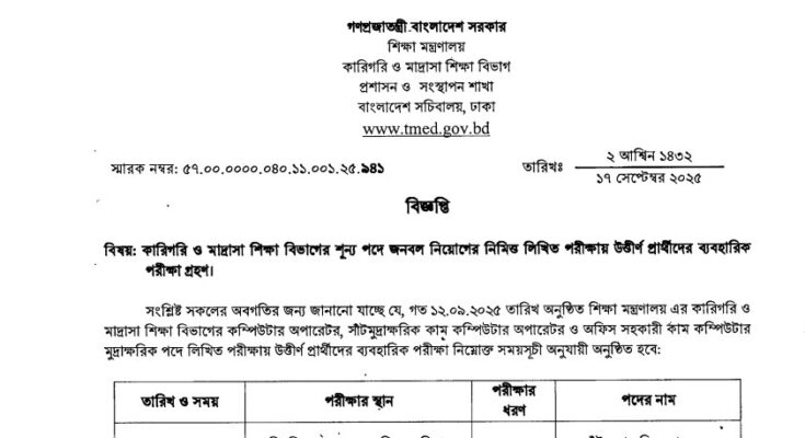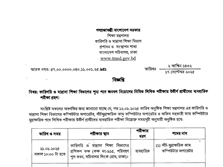TMED Practical Test Date 2025 has been published. The Technical and Madrasah Education Division Practical Test Date 2025 has been published by the authority. The TMED Computer Typing Test Date 2025 is good news for job seekers in Bangladesh. All information on the Technical and Madrasah Education Division Practical Test Date 2025 is available below. The Technical and Madrasah Education Division (TMED) is a Government Organization in Bangladesh.