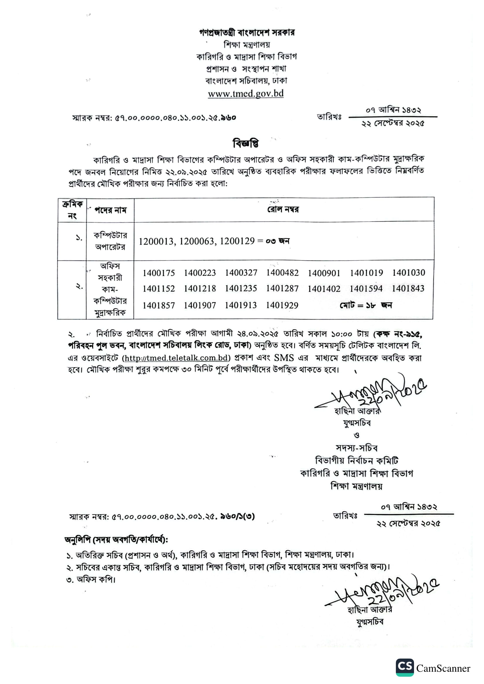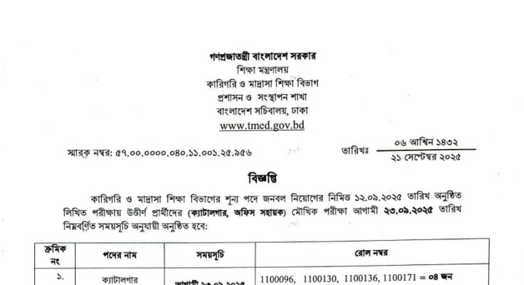 TMED Viva Date 2025 has been published. The Technical and Madrasah Education Division Viva Date 2025 has been published by the authority. The TMED Office Sohayok Viva Date 2025 is good news for job seekers in Bangladesh. All information on the Technical and Madrasah Education Division Steno Typist Cum Computer Operator Viva Date 2025 is available below. The Technical and Madrasah Education Division (TMED) is a Government Organization in Bangladesh.