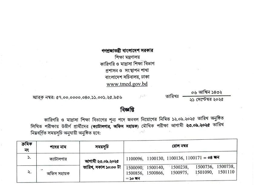 TMED Viva Date 2025 has been published. The Technical and Madrasah Education Division Viva Date 2025 has been published by the authority. The TMED Office Sohayok Viva Date 2025 is good news for job seekers in Bangladesh. All information on the Technical and Madrasah Education Division Steno Typist Cum Computer Operator Viva Date 2025 is available below. The Technical and Madrasah Education Division (TMED) is a Government Organization in Bangladesh.